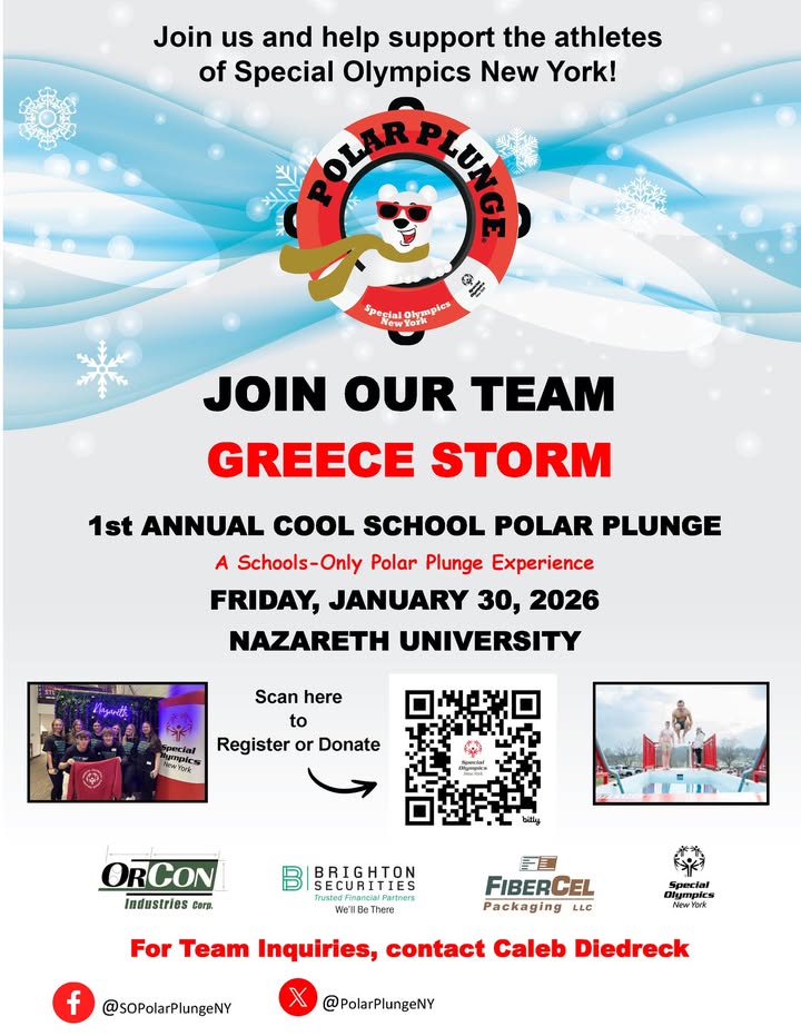 The Greece Storm Unified Leadership Club is participating in the Rochester Schools Only Polar Plunge to support Special Olympics New York. The event is part of the 1st Annual Cool School Polar Plunge and is scheduled for Friday, January 30, 2026 at Nazareth University. Participants will take the plunge in cold water to raise funds that help provide sports, friendships, and opportunities for Special Olympics New York athletes, at no cost to the athletes or their families.